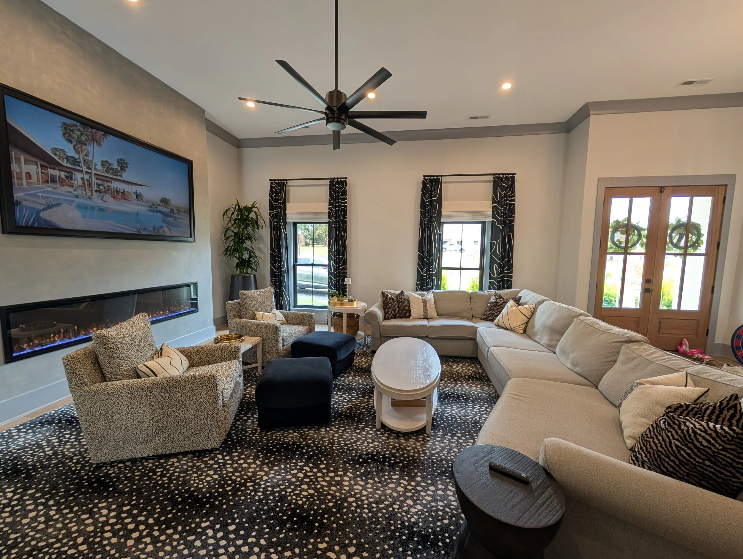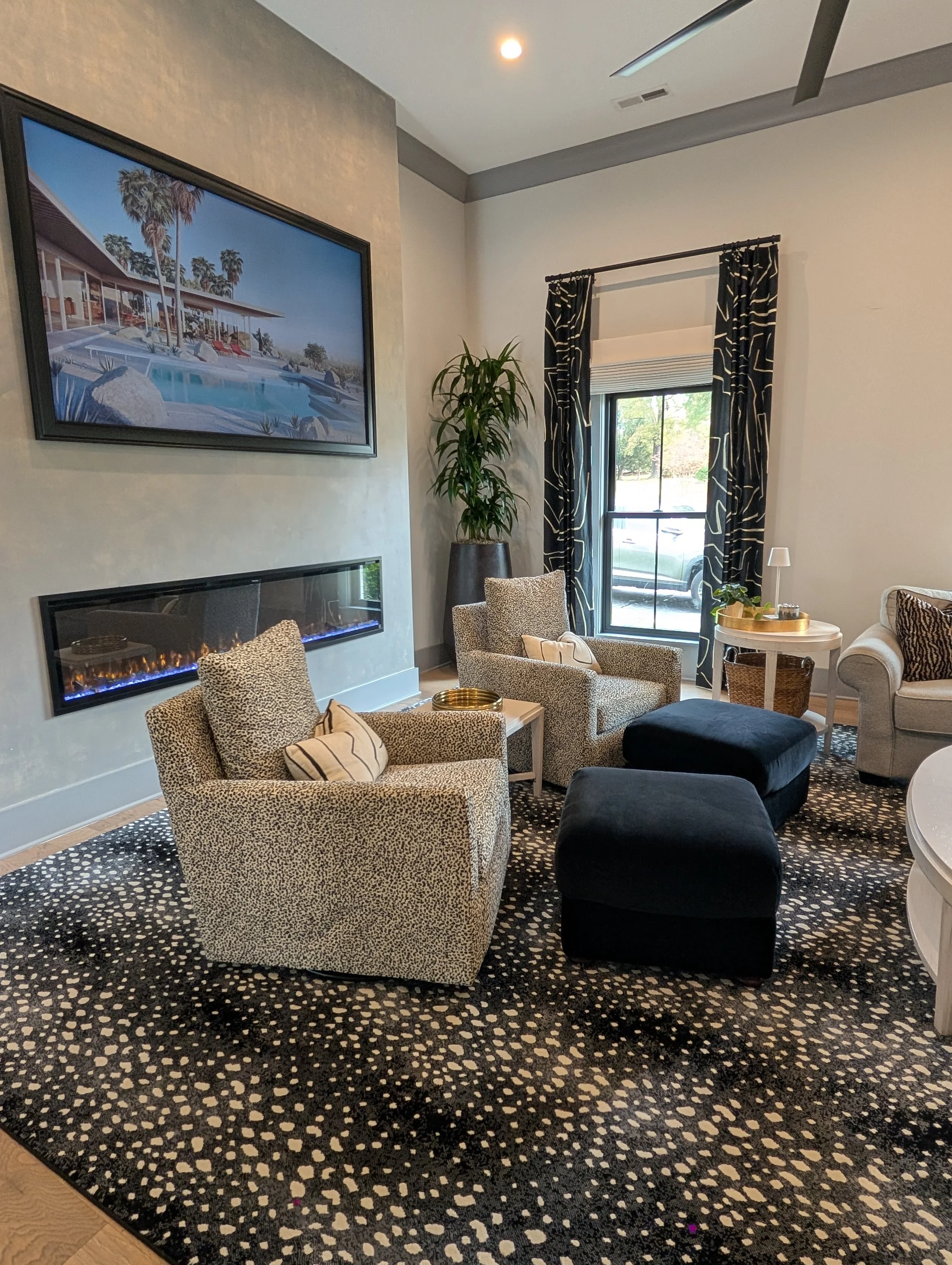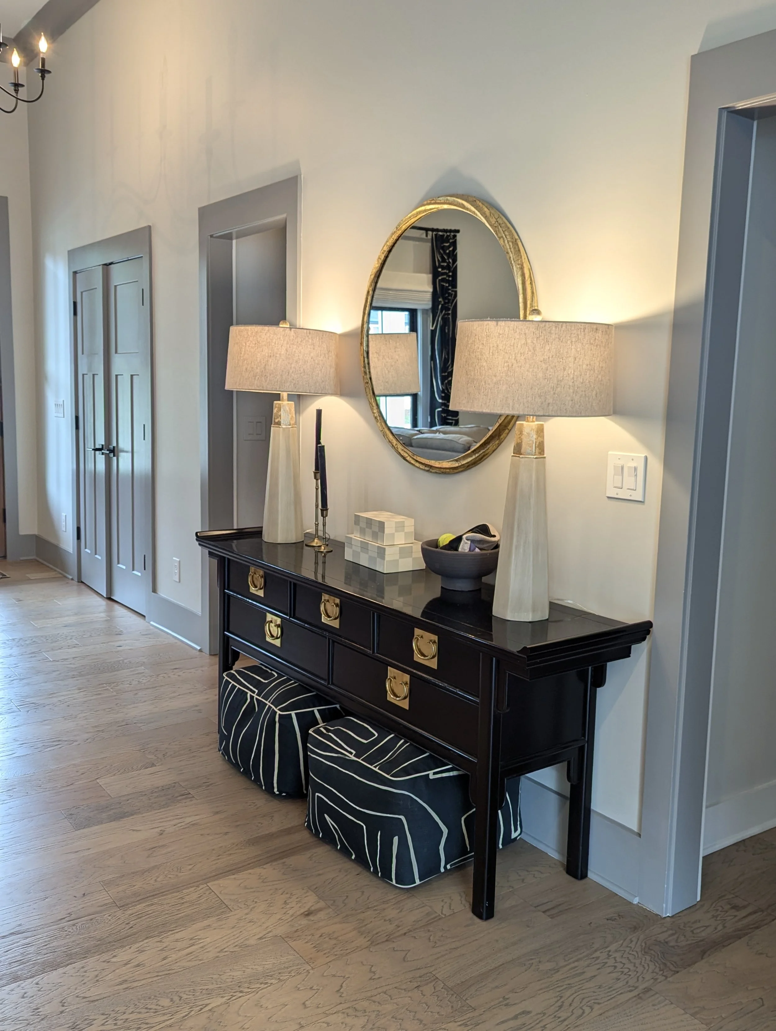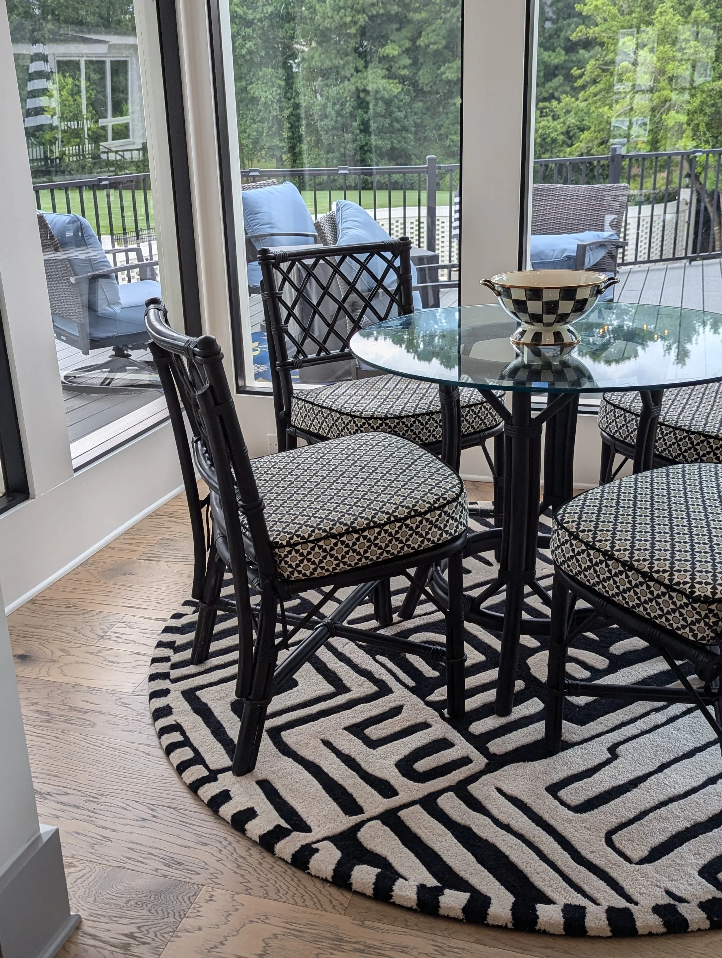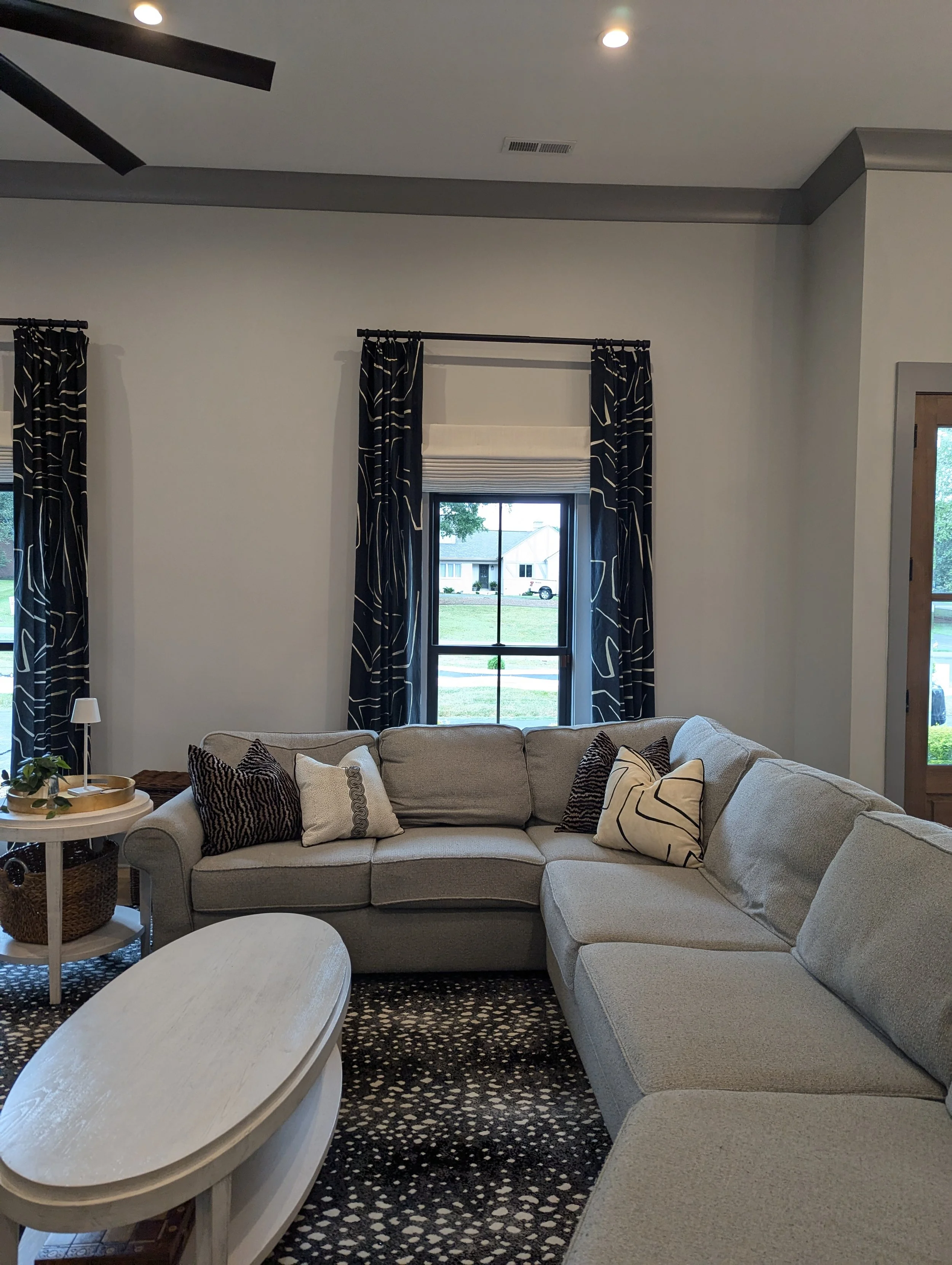 This was such a fun project full of drama! Personally I gravitate towards color and blue and white, but the client wanted all neutrals. The actual request was a boujee living room! The space was a little monotone with all of the same shades of gray, so we added depth and drama with some deep black and bright white, and layered in so many fun prints! The result is so stunning and balanced, and we also added in some very practical elements like the custom motorized roman shades. The tall curtain panels in graffito make a huge statement, and we made new pillows, cushions and fun poufs & ottomans in a variety a mix and match prints.,