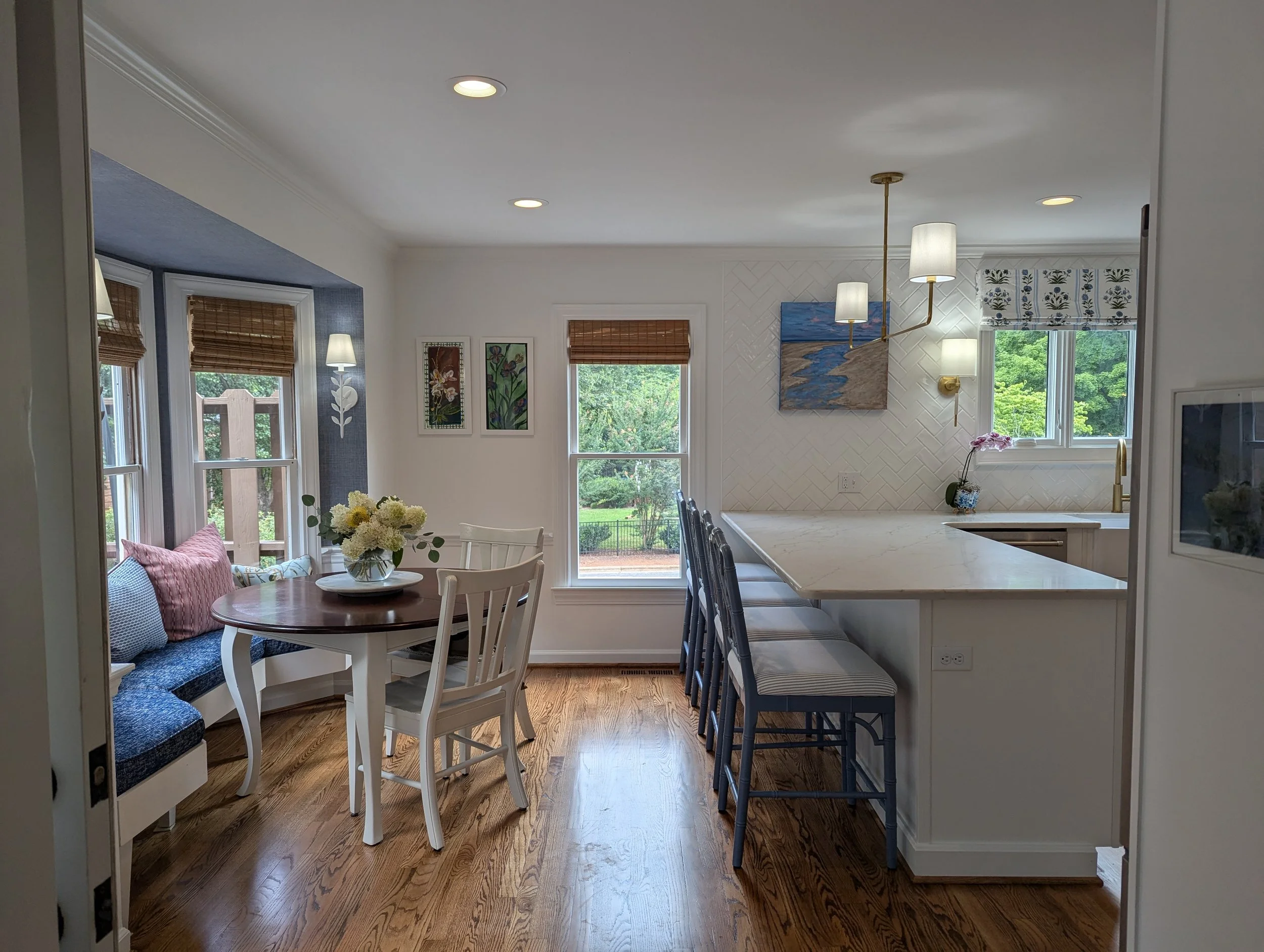 We turned the old breakfast space that just had a table, into a double use area with a cozy breakfast nook tucked into the bay window and counter stools at the new overhang. The breakfast nook was stage one of our project, and we had a bench custom built for the space with a performance pillow and plenty of pillows for comfort. Wrapping the whole are with a blue grasscloth added cozy texture and allowed the delicate white floral sconces to pop.
