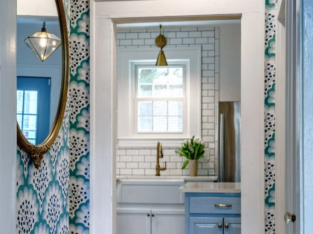 This Blue and white kitchen is a grandmillenial dream. Pops of pink, florals, beautiful Visual Comfort lighting and so many pretty details!